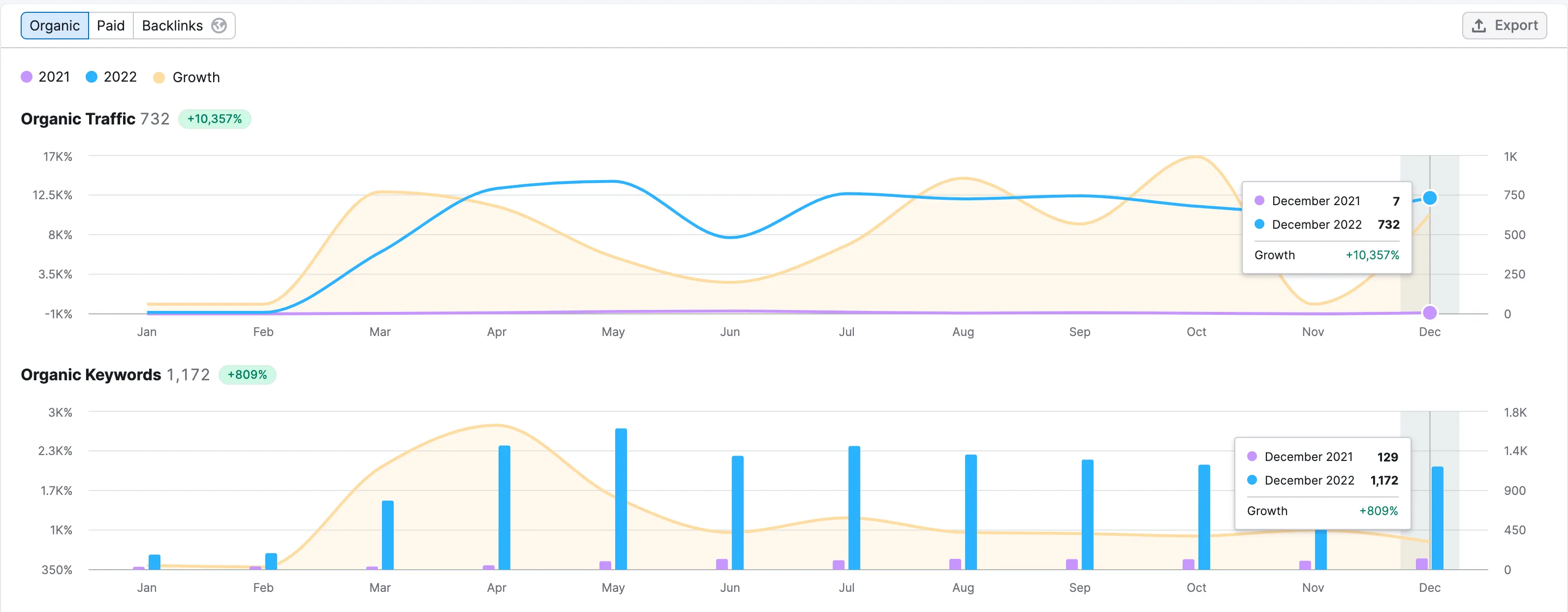 Strategic and consistent SEO practices led to an 809% increase in organic keywords from 2021 to 2022. Carefully crafted content with targeted keywords has made the website more accessible to users seeking relevant information, services, or products.
