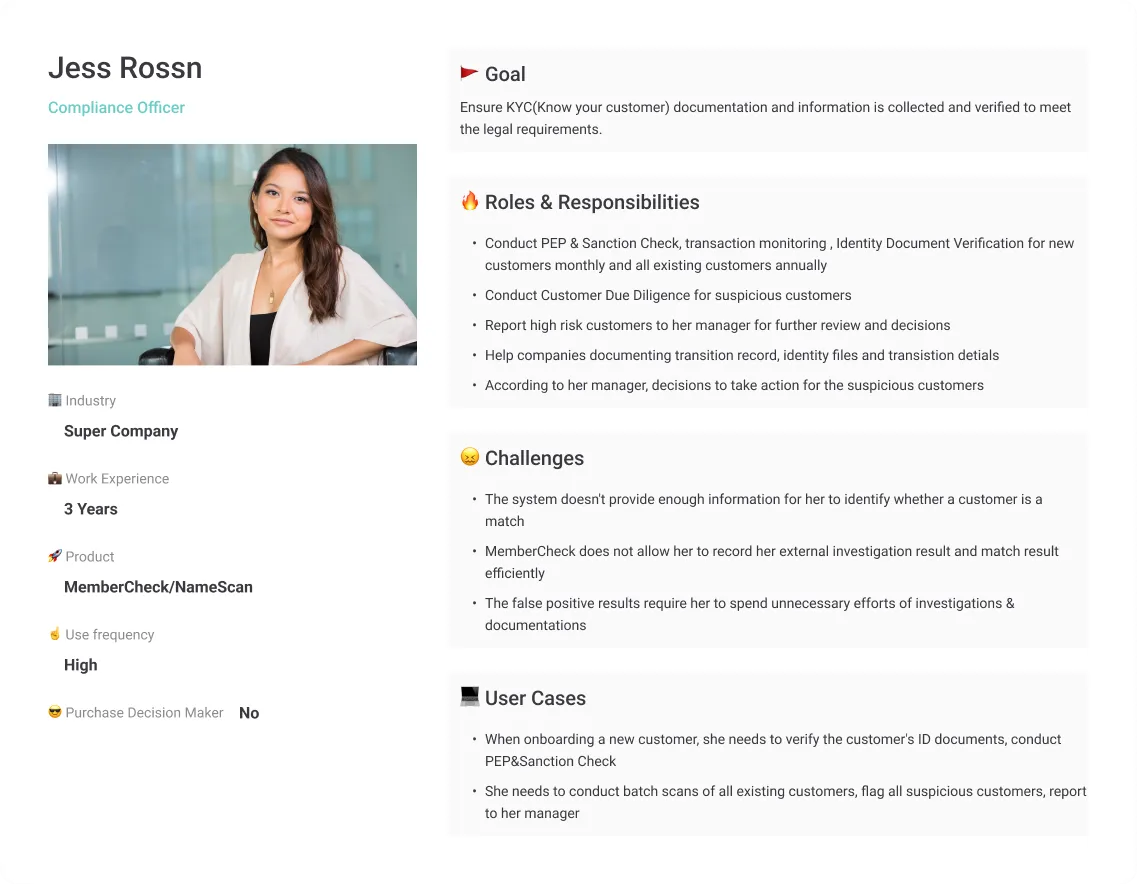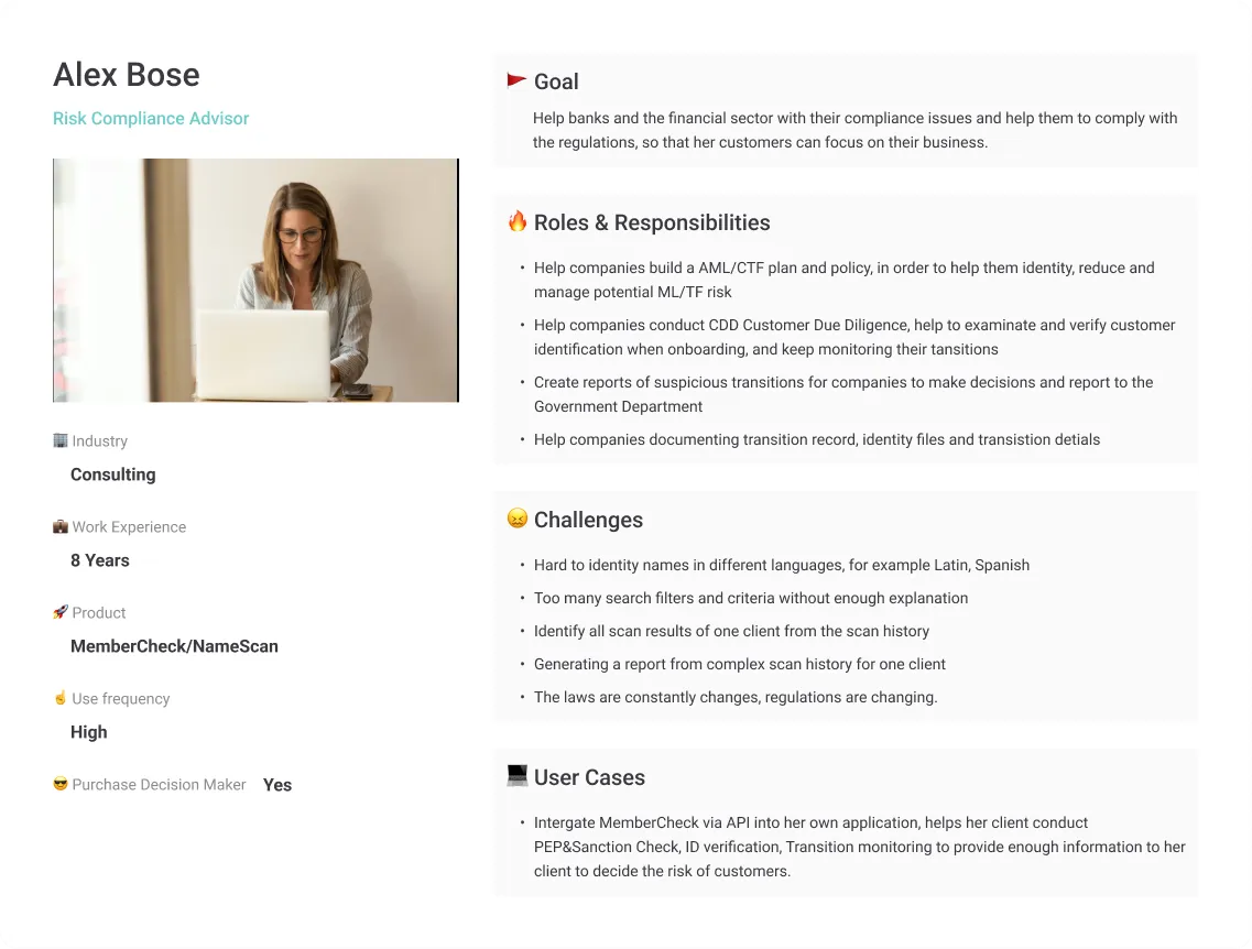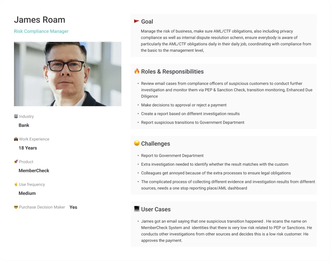 MemberCheck serves risk compliance professionals, including Risk Compliance Advisors, Compliance Officers, and Risk Compliance Managers. These personas, with diverse roles, responsibilities, and experience levels, work to ensure regulatory adherence and risk mitigation within their organisations. They vary in industry backgrounds and influence on decision-making. By understanding their unique needs, goals, and challenges, we can create UX/UI solutions and content strategies tailored specifically for them.